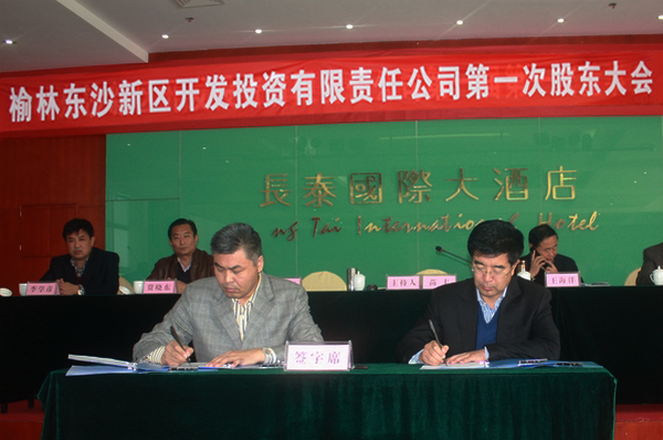 會(huì)議首先由集團(tuán)公司總經(jīng)理李亞光介紹《榆林東沙新區(qū)開發(fā)投資有限責(zé)任公司章程》(以下簡(jiǎn)稱《章程》),各位股東代表審議通過(guò)了《章程》,并由雙方股東代表簽字。