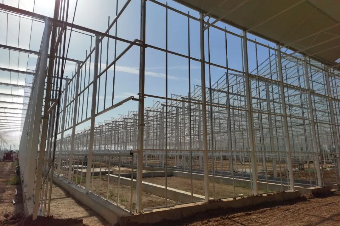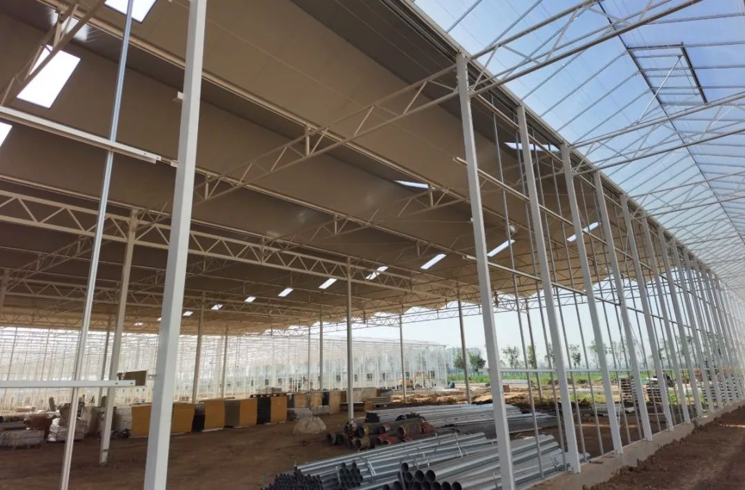 截止目前,玫瑰鮮切花溫室30720㎡和紅掌鮮切花溫室19668㎡主體結(jié)構(gòu)、頂部及立面玻璃覆蓋、三層網(wǎng)托壓幕線、暖通工程及給排水工程地下管網(wǎng)、CO2補充系統(tǒng)等已完成安裝,溫室頂開窗傳動系統(tǒng)完成80%、內(nèi)遮陽內(nèi)保溫鋼纜驅(qū)動系統(tǒng)完成70%。玫瑰溫室半封閉結(jié)構(gòu),紅掌溫室濕簾及負壓風機等已完成安裝。