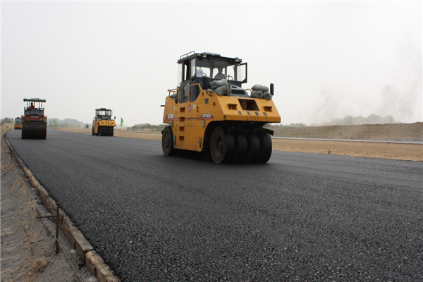 瀝青混凝土面層攤鋪采用先進(jìn)的機(jī)械組合,采用履帶式新型攤鋪機(jī),以滿足路面寬度的要求梯隊作業(yè)。攤鋪過程中,測量人員隨時對已鋪路面的高程、厚度進(jìn)行跟蹤測量,發(fā)現(xiàn)超偏差時及時通知攤鋪負(fù)責(zé)人進(jìn)行調(diào)整。路面面層設(shè)計上、中、下三層面層,上面層厚4cm;中面層厚6cm;下面層厚10cm,路面單幅寬15m,共15.4km,基層頂設(shè)置透層、下封層,三層面層層間設(shè)置粘層。瀝青混凝土采用機(jī)械碾壓,按初壓、復(fù)壓、終壓三個階段進(jìn)行。壓路機(jī)保持以慢而均勻的速度碾壓,避免產(chǎn)生推移和擁包。