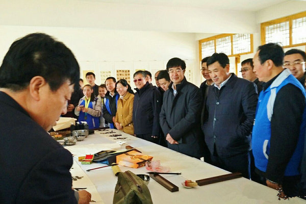 基泰路橋公司總經(jīng)理李學(xué)彥(右三)陪同苗豐書(shū)記參觀了書(shū)畫(huà)展、書(shū)法現(xiàn)場(chǎng)筆會(huì)、攝影展、文藝演出、常樂(lè)堡老年幸福院等,并為牛家梁鎮(zhèn)評(píng)選出的十個(gè)“十佳”稱號(hào)獲得者頒獎(jiǎng)。