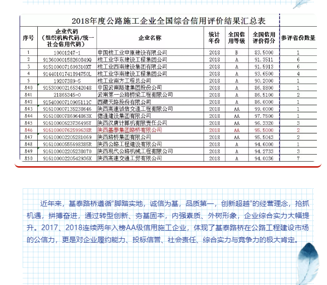 基泰路橋再次入榜全國(guó)AA級(jí)信用公路施工企業(yè)